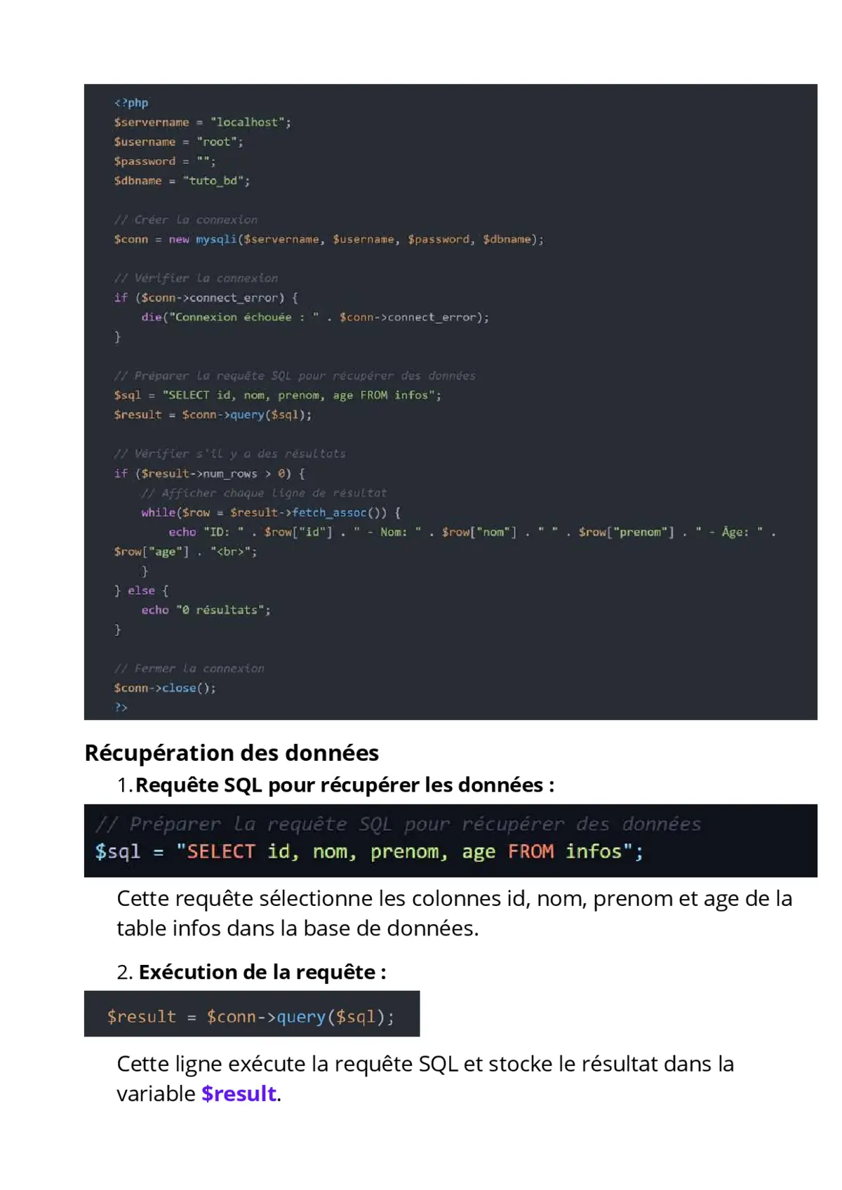 - Code PHP pour se connecter à la base de données