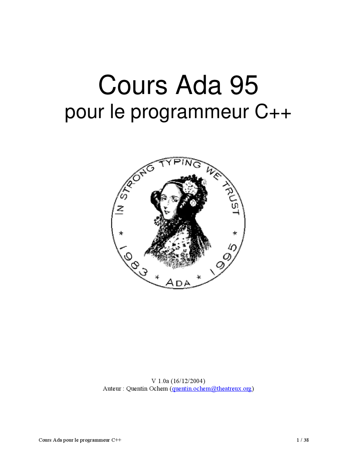 Ce cours sur Ada 95 offre une immersion complète dans les fondamentaux et les concepts avancés du langage, spécialement conçu pour les développeurs maîtrisant le C++. Vous découvrirez la syntaxe spécifique d'Ada, sa gestion rigoureuse des types, ainsi que ses mécanismes de programmation modulaire et orientée objet. Les aspects clés comme la généricité, la gestion des exceptions et la programmation concurrente sont abordés en profondeur pour une transition fluide vers Ada.