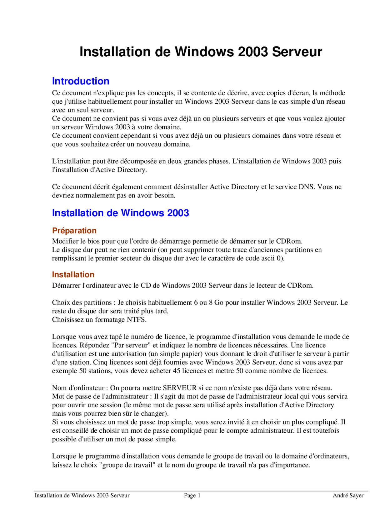 Ce document n'explique pas les concepts, il se contente de décrire, avec copies d'écran, la méthode que j'utilise habituellement pour installer un Windows 2003 Serveur dans le cas simple d'un réseau avec un seul serveur.