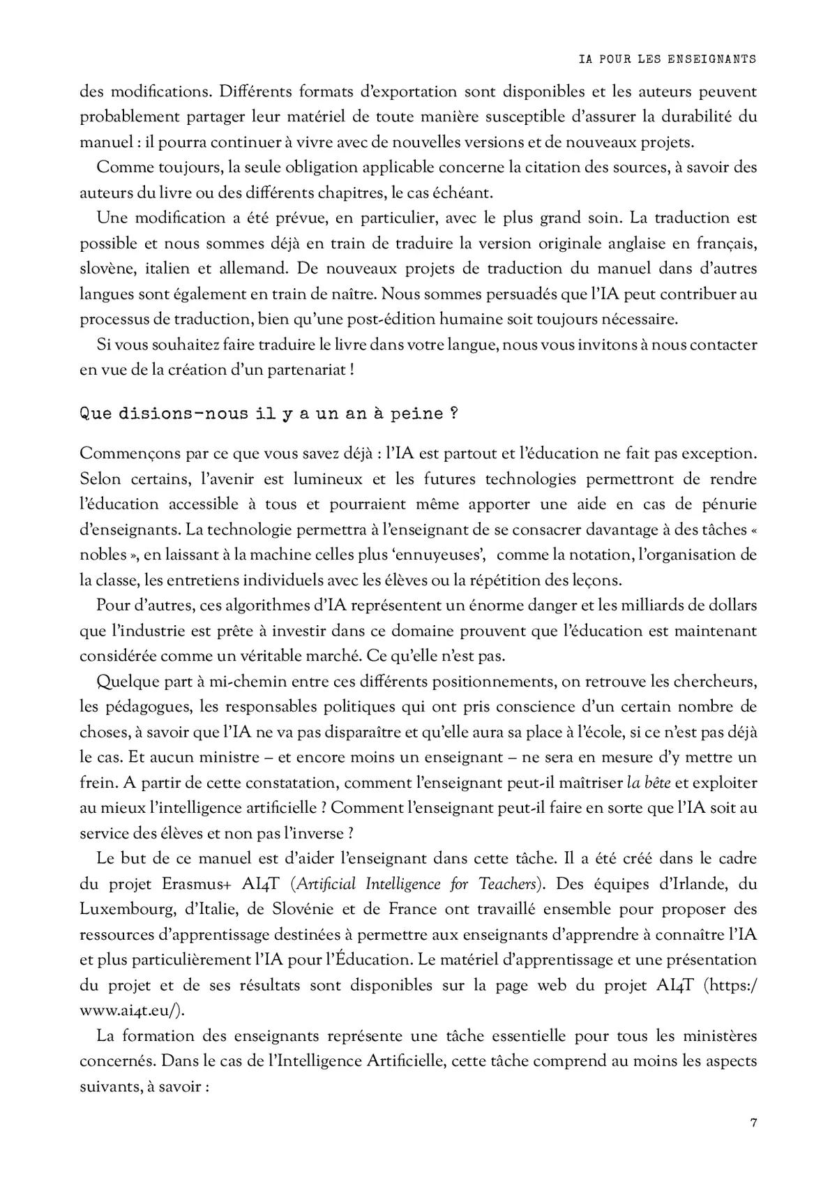Le manuel a été produit dans le cadre du projet AI4T par Colin de la Higuera et Jotsna Iyer et rassemble contributions et retours de terrain. Il combine analyses techniques et ressources pédagogiques pratiques comme des travaux pratiques en apprentissage automatique et des propositions d'activités avec des générateurs de texte. La licence Creative Commons favorise la réutilisation et la traduction, et de nombreuses illustrations et courtes vidéos facilitent la compréhension. En clair, l'approche est pragmatique et orientée vers l'usage en classe, tout en donnant des clés pour discuter l'éthique et la politique éducative.