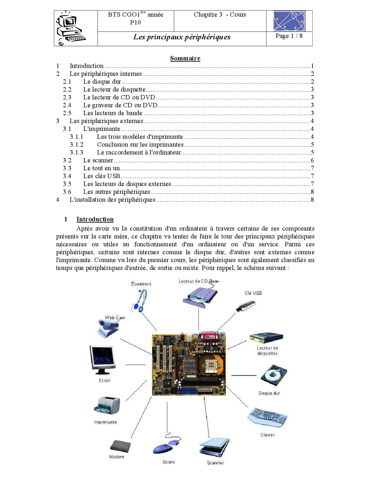 Ce cours offre une analyse approfondie des principaux périphériques informatiques, tant internes qu'externes. Vous découvrirez leur fonctionnement, leur utilité et leur évolution technologique. Les périphériques internes comme les disques durs, lecteurs optiques et bandes magnétiques seront expliqués, ainsi que les périphériques externes tels que les imprimantes, scanners, clés USB et disques externes. Une attention particulière est portée sur les méthodes d'installation et de configuration de ces dispositifs.