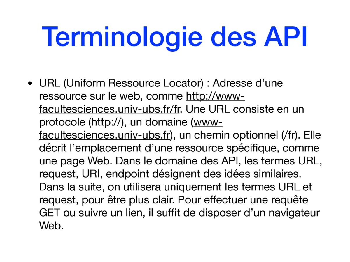 - Conception d'API HTTP et terminologie — définitions opérationnelles : HTTP, URL, endpoint et méthodes (GET/POST). Compréhension des implications de ces notions sur la conception d'API robustes et cohérentes pour l'exposition de ressources.